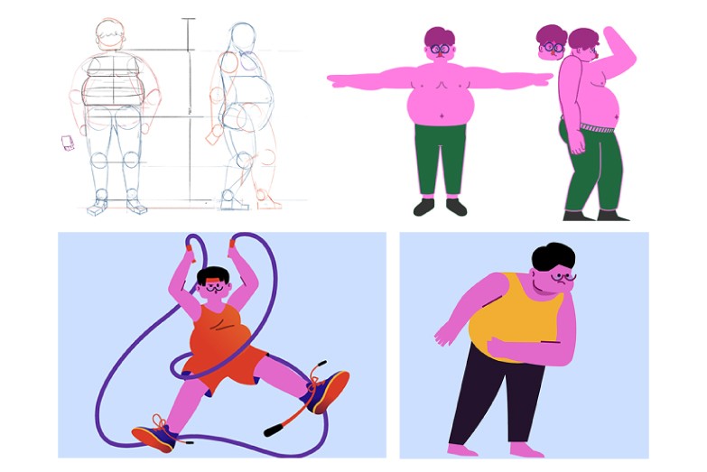 Để thể hiện câu chuyện này một cách nhẹ nhàng, hài hước, tránh gợi cảm xúc không tốt về vấn đề béo phì, mình lựa chọn hình ảnh một nhân vật màu hồng mũm mĩm lạc vào một thế giới tưởng tượng - trong đó có một sợi dây nhảy được đặt trang trọng trên bục đá, tượng trưng cho mong muốn và quyết tâm giảm cân.